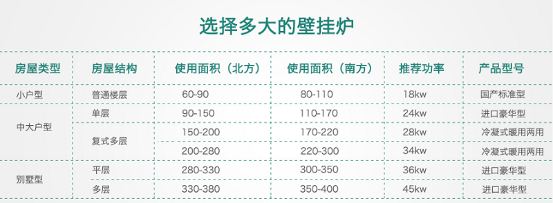 確定了采暖方式,下一步就要確定我到底需要多大的壁掛爐,根據家中的采暖面積和熱水需求,基本可以找出自己需要的壁掛爐大小。